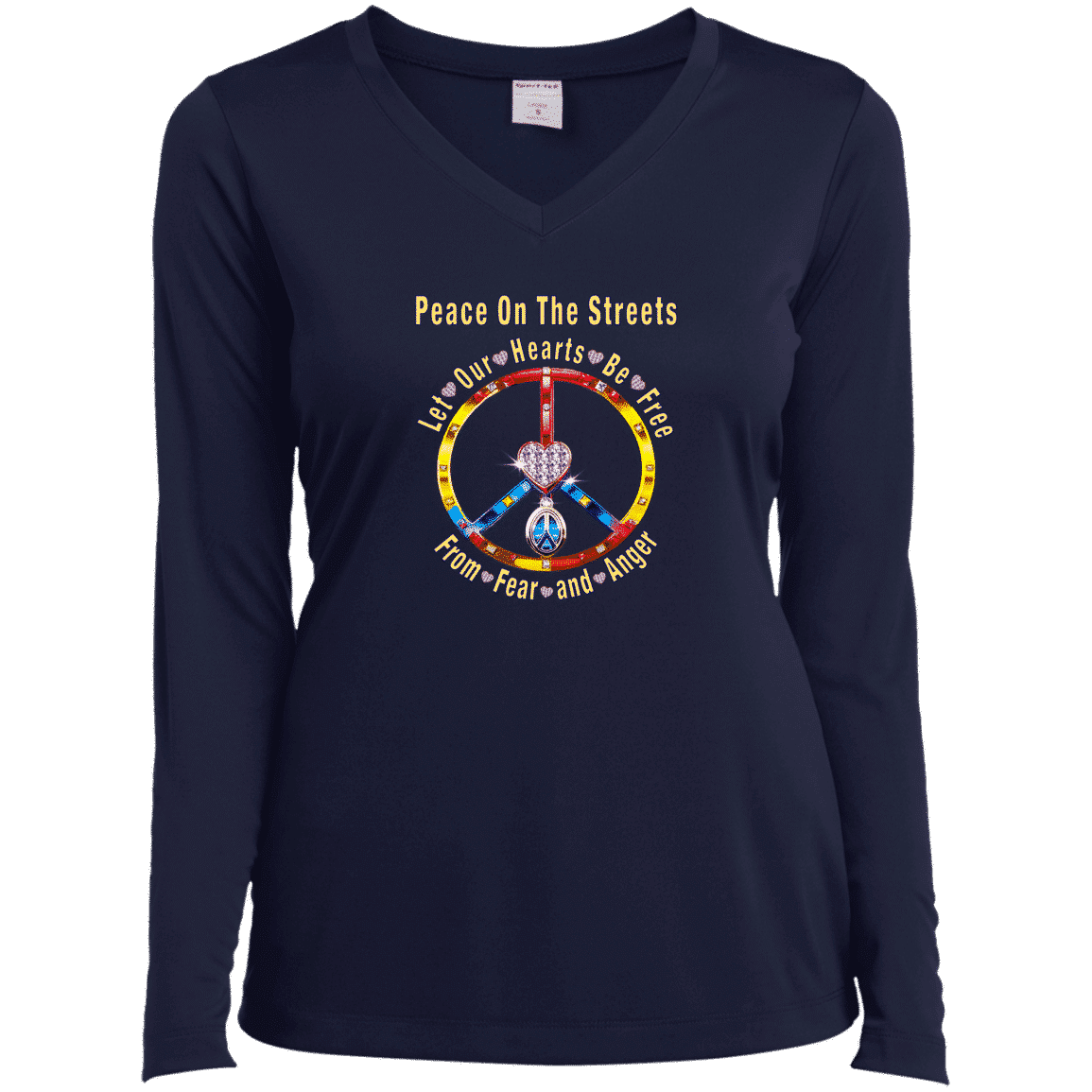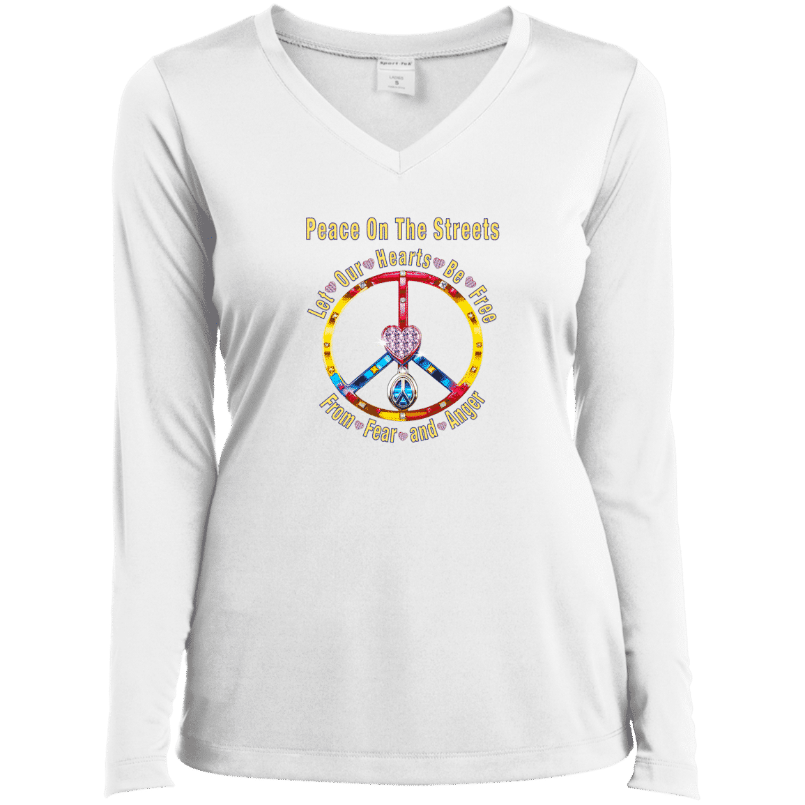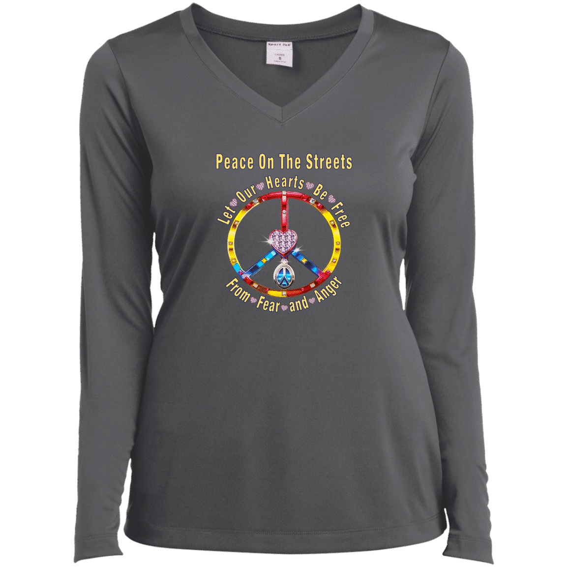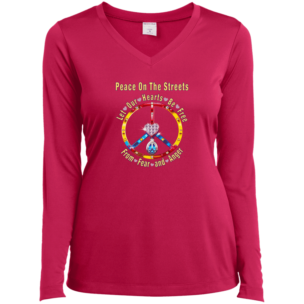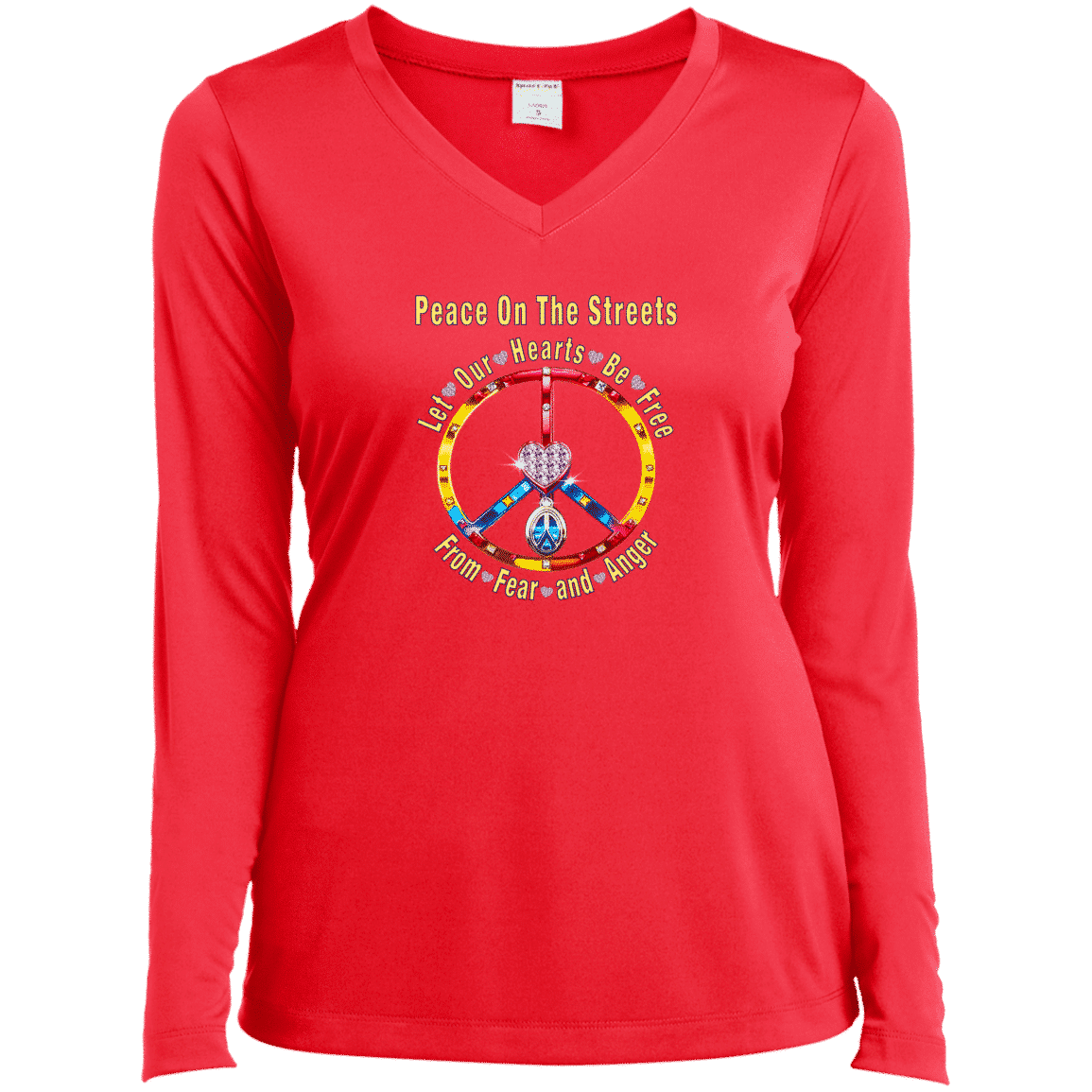 Peace Heart – Let Our Hearts Be Free Ladies’ Long Sleeve Performance V-Neck Tee